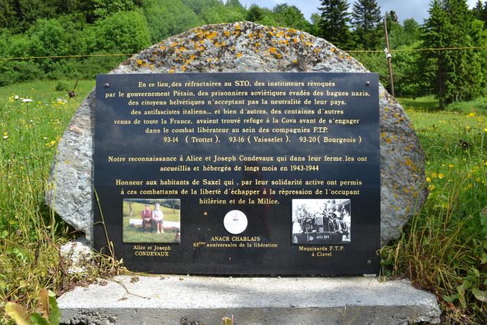 Une stèle est érigée en Juin 2010 en souvenir de la Famille CONDEVAUX qui a accueilli, à la Covaz, entre 350 et 400 maquisards lors de la Seconde Guerre Mondiale.