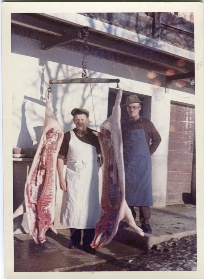 Photographie couleur de deux hommes présentant les deux moitiés d'un cochon tué, à Ludran, Saint-André-de-Boëge.