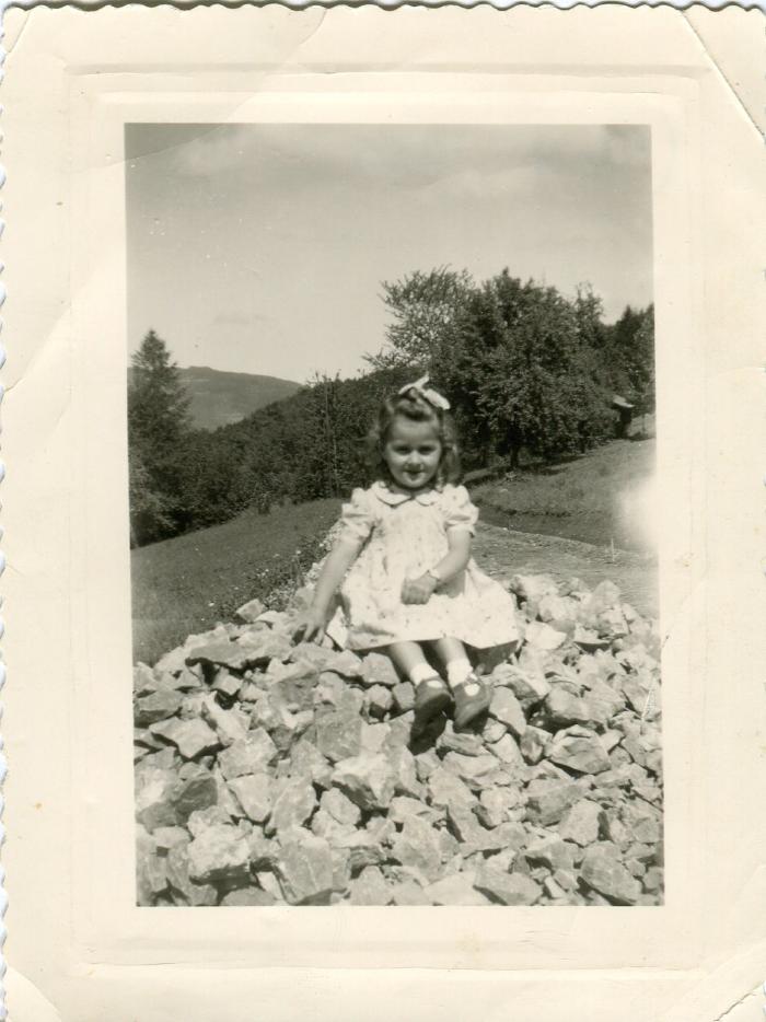 Une fillette sur un tas de cailloux à Ludran, Saint-André-de-Boëge.