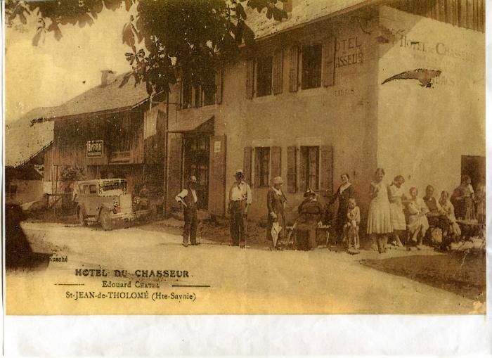 Cette carte postale publicaitaire de l'hôtel du chasseur à Saint-Jean-de-Tholome est animée, Plusieurs personnes posent devant l'établissement, En bas à gauche de l'image, on retrouve le nom du propriétaire de l'hôtel avec ses coordonnées, Le cliché est signé RUSCHE à Bonneville,