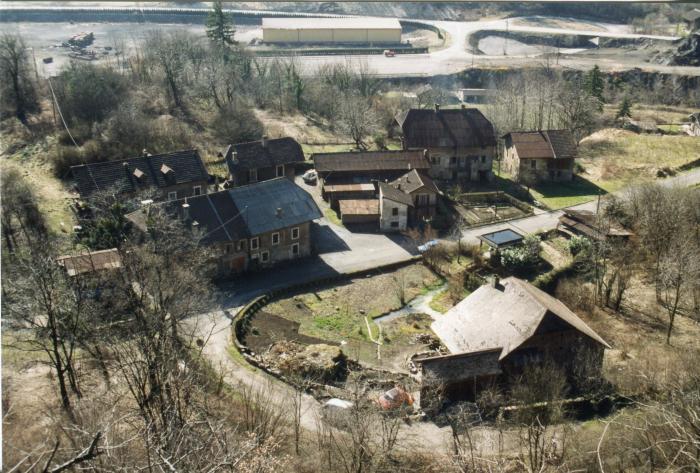 Photographie en couleur représentant le village d'Hanton. En arrière plan, on aperçoit une partie des installations de l'usine du Giffre. Il s'agit d'une vue en plongée.