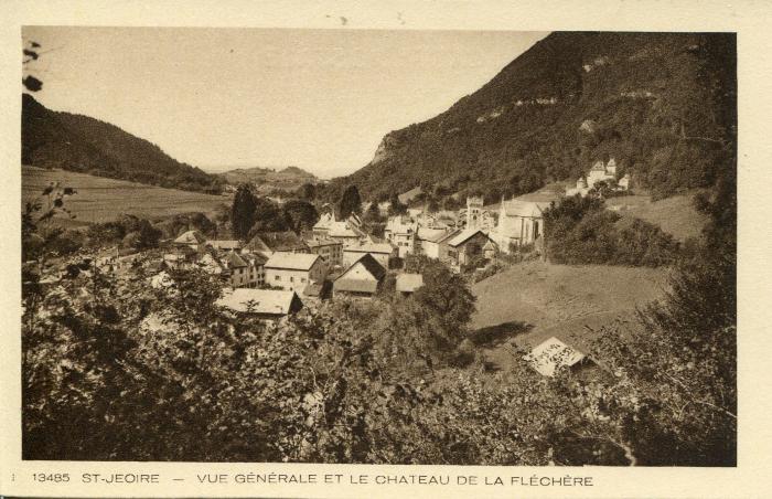 Saint-Jeoire-en-Faucigny: vue générale et le château de la Fléchère Carte postale ancienne sépia.