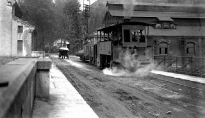 Photographie en noir et blanc du matériel roulant du CEN sur le pont de l'usine du Giffre.