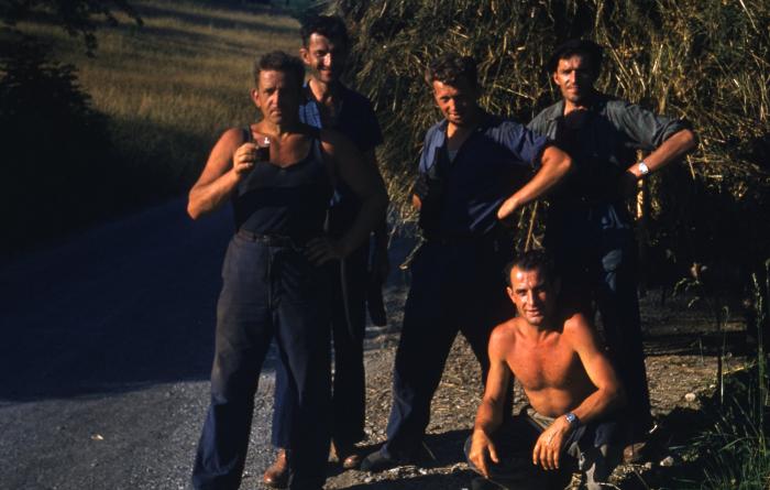Photographie en couleur représentant un groupe de paysan en pause pendant les foins à Viuz-en-Sallaz. En arrière-plan, le char à foin chargé.
