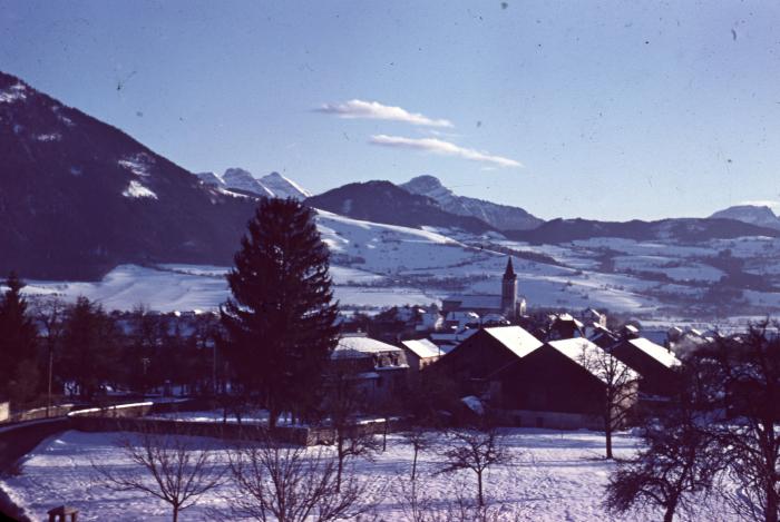 Photographie en couleur représentant le chef-lieu de Viuz-en-Sallaz en hiver avec le Môle.