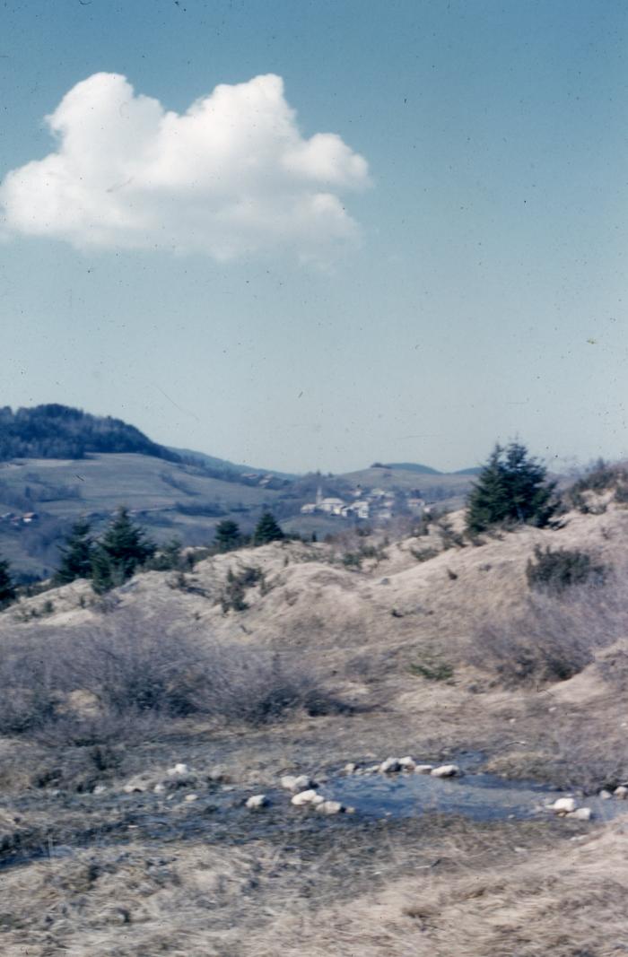 Photographie en couleur représentant au loin le chef-lieu de Viuz-en-Sallaz après la fonte des neiges. Au premier plan, un terrain marécageux.