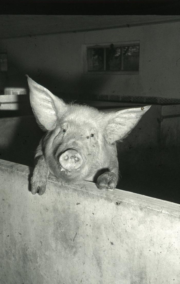 Photographie en noir et blanc de l'intérieur de la porcherie de Viuz-en-Sallaz.