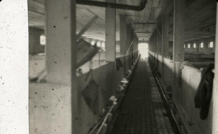 Photographie en noir et blanc de l'intérieur de la porcherie de Viuz-en-Sallaz, plus particulièrement, les compartiments à cochons.
