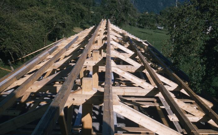 Photographie en couleur représentant la construction de la porcherie de Viuz-en-Sallaz.