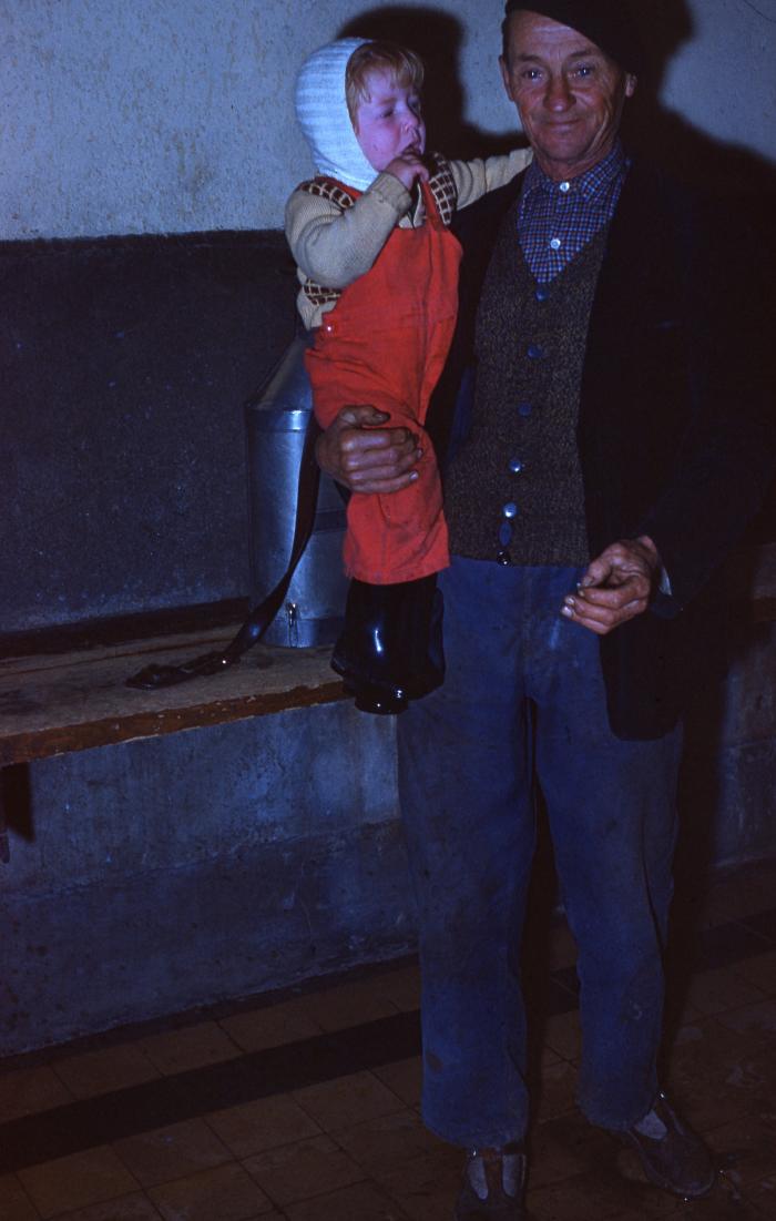 Photographie en couleur représentant le dépôt de lait à la fruitière de Viuz-en-Sallaz par les sociétaires. Mme Küffer est ici âgée de quelques années.
