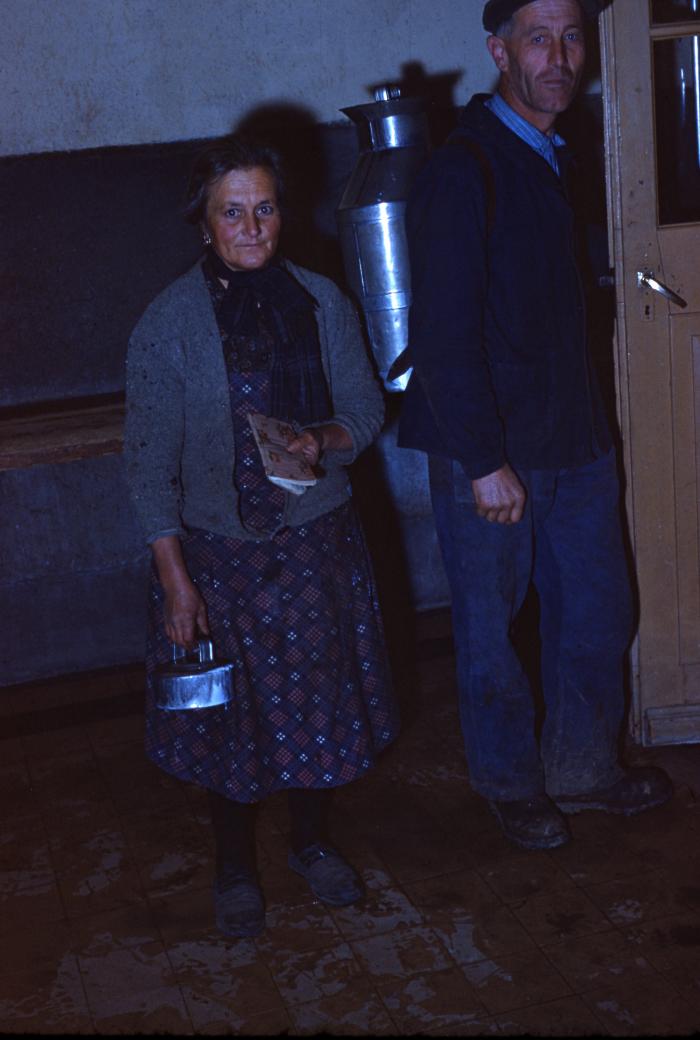 Photographie en couleur représentant le dépôt de lait à la fruitière de Viuz-en-Sallaz par les sociétaires (Eugénie Bastian et André Musy).