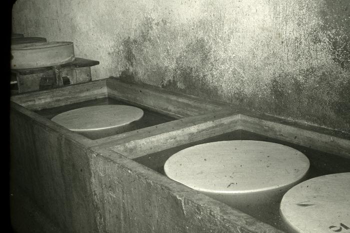 Photographie en noir et blanc représentant la transformation du lait en fromage à la fruitière de Viuz-en-Sallaz.