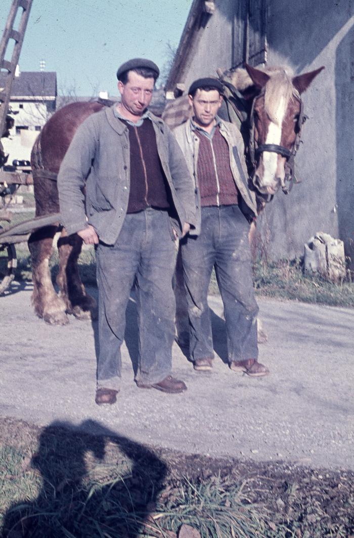 Photographie en couleur représentant le transport du lait à la fruitière de Viuz-en-Sallaz. Il s'agiarit de Paul Wargnier et François Gavard-Lebleu.