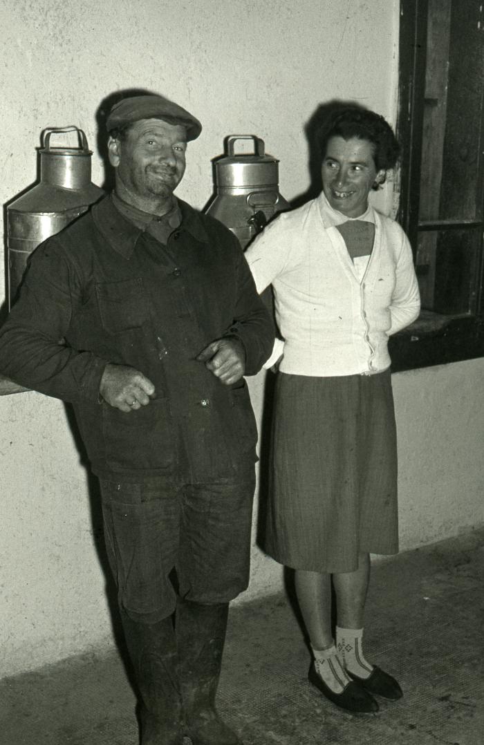 Photographie en noir et blanc représentant le dépôt de lait à la fruitière de Viuz-en-Sallaz par les sociétaires.