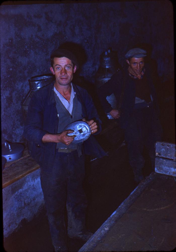Photographie en couleur représentant le dépôt de lait à la fruitière de Viuz-en-Sallaz par les sociétaires.(Louis et Michel Bajolaz)