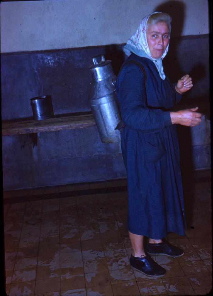 Photographie en couleur représentant le dépôt de lait à la fruitière de Viuz-en-Sallaz par les sociétaires.(Louise Piccot -Rachet)