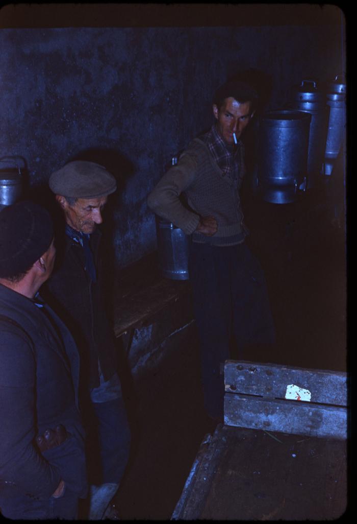 Photographie en couleur représentant le dépôt de lait à la fruitière de Viuz-en-Sallaz par les sociétaires.
