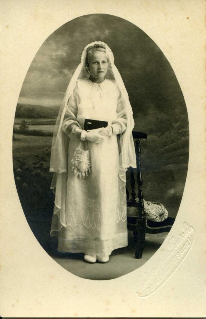 Cliché daté des années 1920, signé Hermann RUSCHE à Bonneville. Il représente une jeune femme se rendant à un mariage à Viuz-en-Sallaz. Si la prise de vue a été réalisée dans un studio de photographe, la tenue vestimentaire témoigne d'une époque où les personnes « s'endimanchaient » pour les grandes occasions.