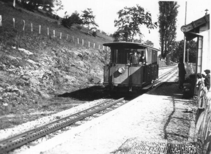« Halte de Haut-Mornex du chemin de fer à crémaillère du Salève dans le vallon des Châtaigniers (automotrice en version de la 1ère époque) ».