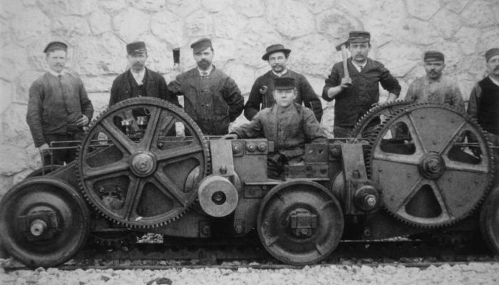 « Châssis d'une automotrice du chemin de fer à crémaillère au dépôt d'Etrembières. La vitesse permise sur la pente la plus forte est de 6 km/h ou 100 mètres par minute, correspondant à 50 tours/minute aux pignons, leur cercle primitif ayant une circonférence de 2 mètres et le rapport de réduction des engrenages étant de 1:12 ».
