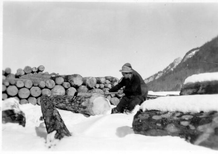 Un homme découpe du bois à côté de piles de billons, dans la neige.