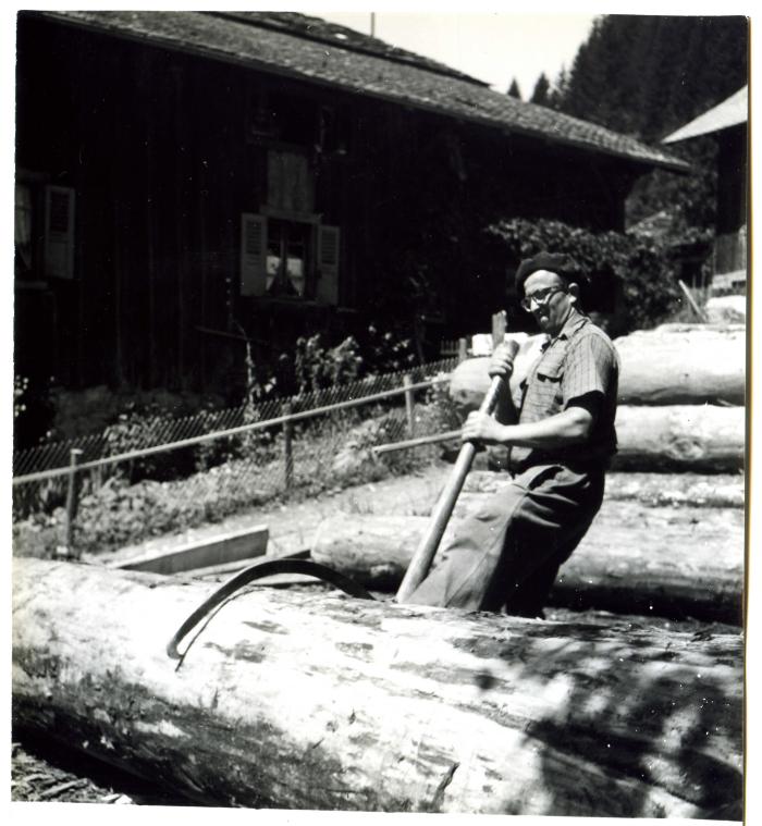 Photographie en noir et blanc représentant un homme utilisant une pince à bois sur un billot.