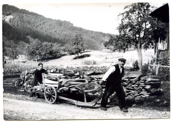 Homme tirant un becquet sur lequel repose des tranches de bois aidé par un jeune homme qui semble pousser dehors.