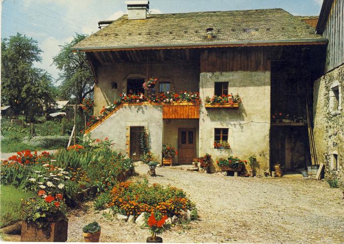 Carte postale représentant une ferme à Saint-Jeoire-en-Faucigny. Au premier plan, la cour très fleurie. En arrière plan, le bâtiment vu de face.