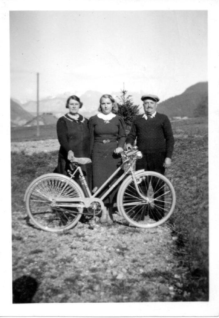 « Paulette, ma mère est fière de poser avec sa première bicyclette ! (à la fois outil de travail et de loisirs) On reconnait au fond derrière les personnages, la colline de La Tour surnommée "le calvaire" par les habitants. Mes grands parents maternels étaient en qualité de concierges logés dans le Bâtiment administratif. Pour la petite histoire, Edmond le grand père, mécanicien de profession et GIG de la guerre de 14/18, s'est vu proposer par les services de reclassement de la mairie du 20ème arrondissement de Paris où il résidait, un poste de concierge en Haute Savoie....! Les bruits de bottes des années 30, ses blessures de plus en plus invalidantes et une petite famille à nourrir, ont eu raison des ses réticences. »