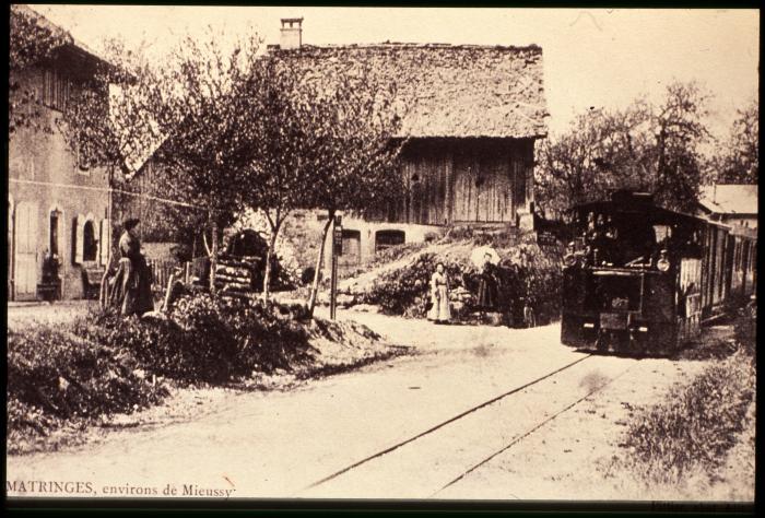 Carte postale en noir et blanc représentant le passage du CEN à Matringes, proche de Mieussy.