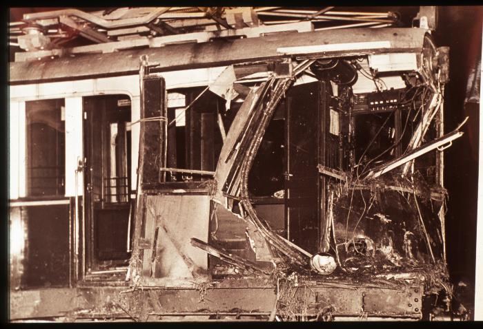 Photographie sépia représentant une partie du CEN après déraillement. Les dégâts sont considérables.