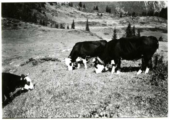 Photographie en noir et blanc représentant un troupeau de vaches broutant. Cette photo appartient au Fonds Albert JUSTIN.