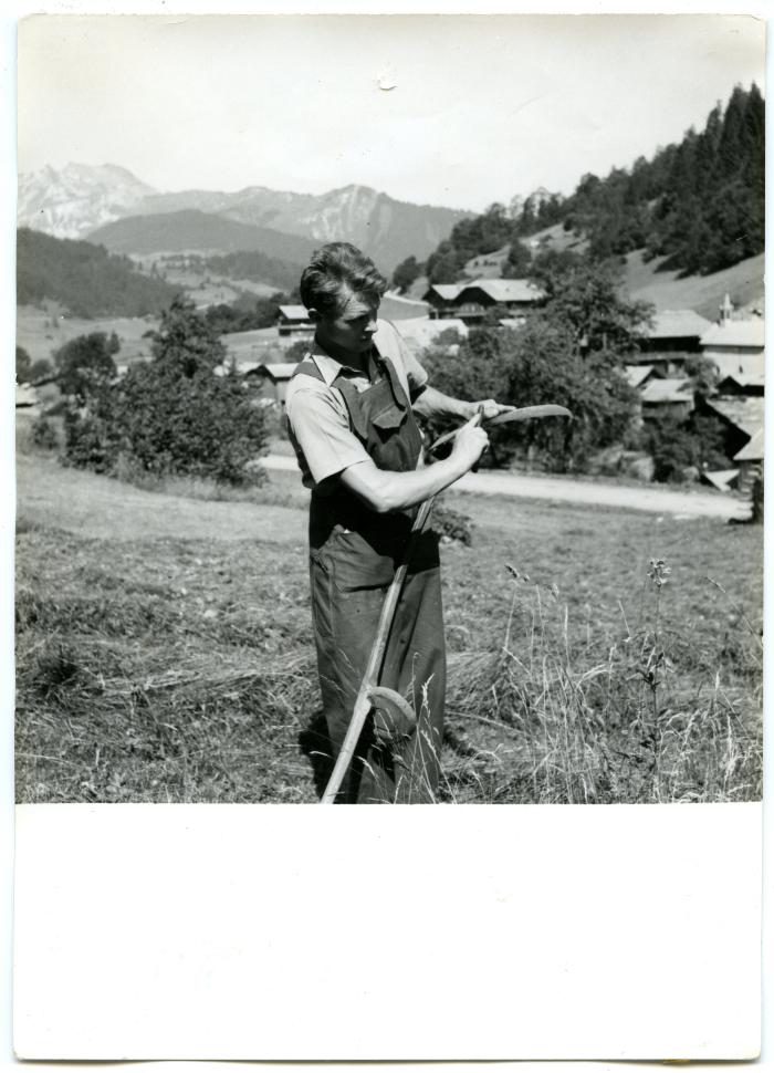 Photographie en noir et blanc représentant un jeune homme qui aiguise sa faux. Cette photographie appartient au Fonds Albert JUSTIN.
