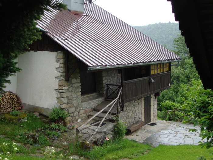 Maison traditionnelle en pierre, la façade est recouverte de crépi et de bardage en bois sur certaines parties.